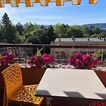 손님들이 테라스에서 음료를 즐길 수 있으며 식사를 할 수 있습니다.